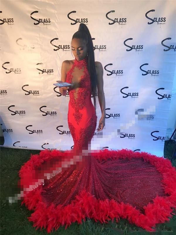 2019 African Arabic Black Girls Red 2k17 Prom Dresses With Feather Mermaid Formal Dress Evening Party Wear Backless Halter Vintage Lace Party Dress Size 16 Party Dresses For 12 Year Olds From